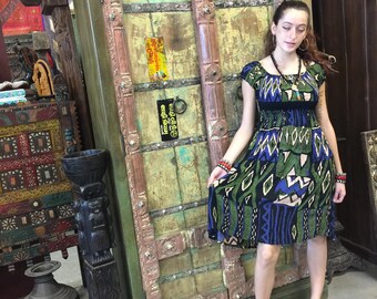 Evelyn Womens Resort Beach Dress Green Spaghetti Strap Recycled Sari Vintage Printed Summer Holiday Sundress S/M