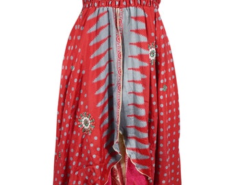 BOHO CHIC Hi LOW Skirt Dress, Beach Skirts Strapless Dress, Two Layer Skirt, Red Printed Boho Dresses, Recycled Sari Skirt S/M