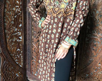 Womens Tunic Dress, Raw Edges Sleeves, Brown Floral Printed Embroidered Summer Boho Tunic Dresses M