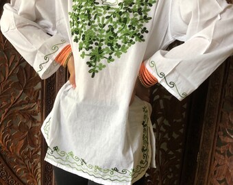 Womens Tunic Top , Summer White Green embroidered Blouse, Cotton Beach Boho Fashion Comfy Tops L