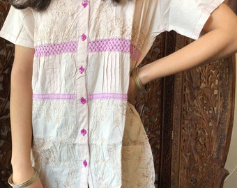 Womens Tunic Dress Floral Pink SequIN EMBROIDERED cotton Summer Bohemian Gypsy chic Blouse Kurti S
