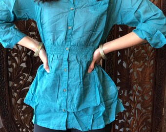 Womens Shirt Blouse cOTTON vOILE Blue Retro 70s BOHO Comfy Summer fITTED Shirt/Top SM