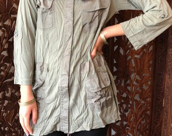 Women's Boho Blouse, Soft Cotton Jersey Shirt Khaki Gray, Button Front Blouse Bohemian Summer Tops M