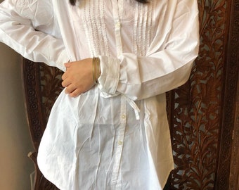 Women White Casual Shirt , Pintucks Button Front loose Blouse Bohemian Summer Boho Chic Cotton Tunic Tops L/XL