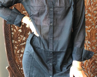 Women Soft Cotton Voile Casual Shirt , Black Button Front Blouse, Bohemian Summer Blouse M