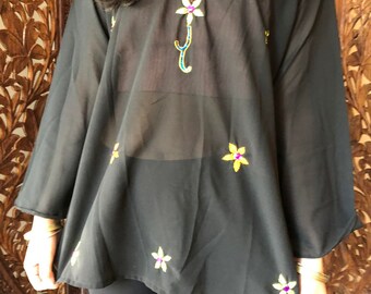Women Boho Tunic Top, Soft Georgette Black Floral Embroidered Top, Casual Summer Blouse/Top M