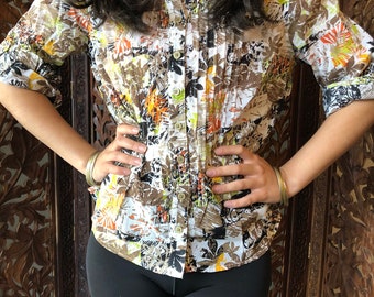 Only 1 available and it's in 1 person's cartWomens Floral Blouse, 70s Retro Pleated Shirt, Yellow Brown Button Front Blouse Bohemian Summer Cotton Tops M