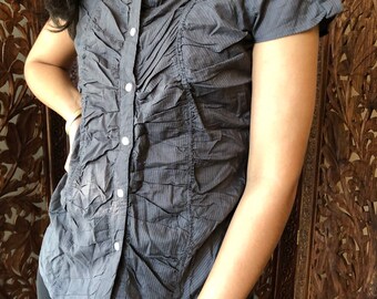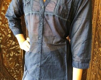 Women Soft Cotton Voile Casual Pleated Shirt , Black Button Front Blouse, Bohemian Summer Blouse S