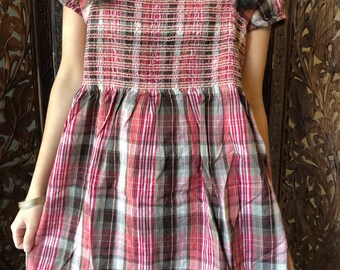 Womens Bohemian blouse, Retro 70s Red Plaid Ruched Printed Top, Handmade Cotton Summer Boho Blouse ML