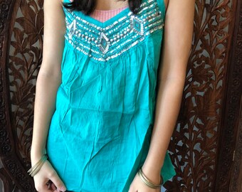 Women's Tank Top Blue sequence Work Blouse Sleeveless Boho Style Scoop Neck Summer Gypsy Tops M