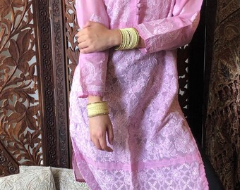 Womens Tunic Top, Pink chikankari hand embroidered Blouse bohemian Cotton Summer Cover Up Tops S
