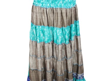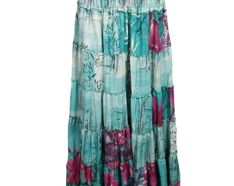 Women Maxi SKIRT, Beach Skirts Strapless Dress, Teal Blue Printed Boho Dresses, Recycled Sari Skirt S/M
