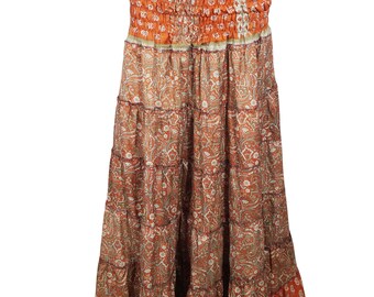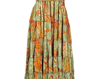 Women Flared Maxi SKIRT, Orange Floral Printed Dress, Summer Beach Dress, Strapless DRess, 2in1 Skirt Dress, Recycled Sari Dresses S/M