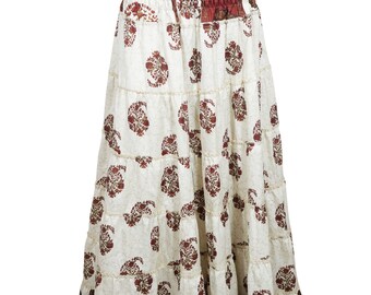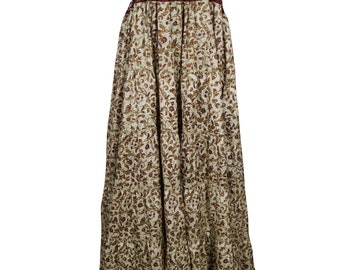 Womens Maxi Skirt, Boho Beige Red Floral Printed Recycled Sari Summer Beach Dresses S/M