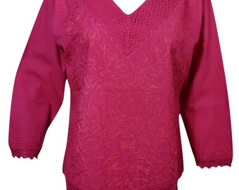 Only 3 leftWomen Blouse Pink Embroidered Summer Style Long Sleeves Summer Comfy Boho Chic Tops M
