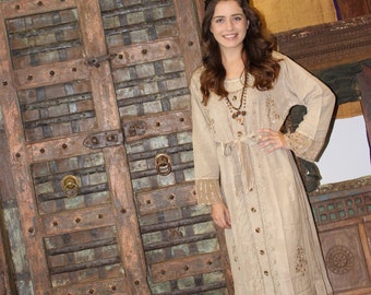 Womens Beige Maxi Dress, Handmade Bohemian Embroidered Summer Soft Comfy Boho Chic Dresses M