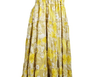 Womens Maxi Skirt Yellow Strapless Dress Floral Printed Recycled Sari Summer Bohemian Skirt S/M