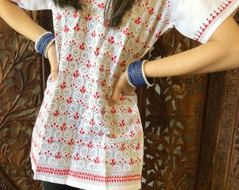 Only 1 available and it's in 1 person's cartWomens Tunic Dress, White Red Cotton Floral Embroidered Beach Boho chic Kurti House Dresses M
