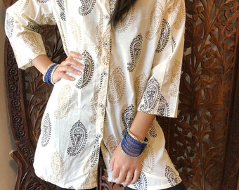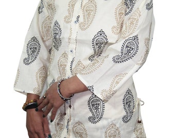Womens Tunic Shirt, Beige Paisley Printed Stay Home Bohemian Summer Casual Cotton Tops M
