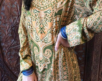 Womens Tunic Blouse,Green Beige Paisley Printed Top, Summer Boho Fashion Comfy Tunic M