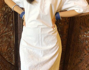 Womens Tunic Dress, White Floral Embroidered Cotton Bohemian Summer Housedress Long Kurti XL