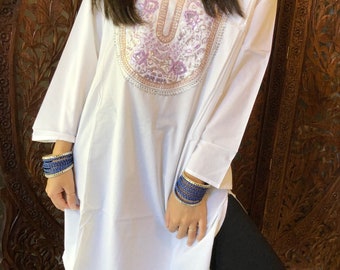 Bohemian White Tunic Blouse, Cotton Floral Embroidered Cover Up Beach Kurti ML