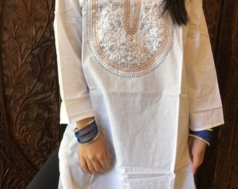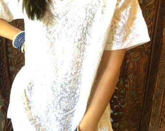 Womens Tunic Top, White chikankari hand embroidered Blouse Cotton Summer Cover Up Tops S