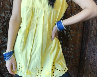 Womens Boho Blouse, Yellow Cutwork Handmade Bohemian Summer Sleeveless Cotton Tops SM