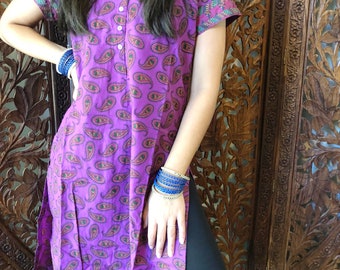 Womens Tunic House Dress, Purple Paisley Printed Cotton Summer Boho Ethnic Indian Tunic M