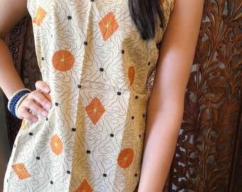 Womens Tunic Dress, Yellow Red Printed Tunic Blouse, Handmade Cotton Summer House Tunic Dresses M