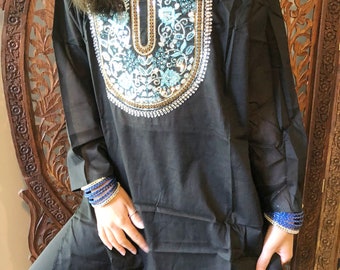 Womens Tunic Dress, Black Floral SOFT Cotton Tunic, Sequin Embroidered Summer Bohemian Housedresses ML