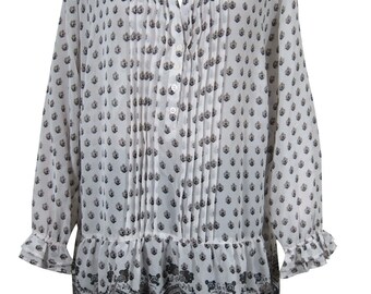 Women's Summer Shirt DRESS, Soft Georgette Pleated White Shirt Dreeses, Retro 70s LOOSE Button Front Printed M