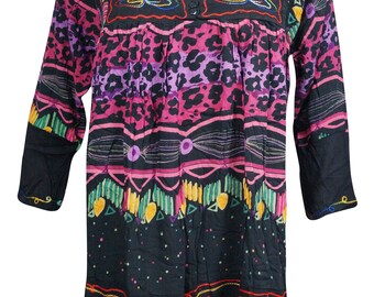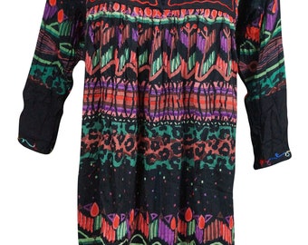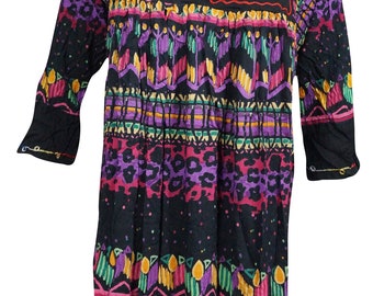 Babydoll Boho Dress, Vintage 70s Funky Hippy Fashion Coverup bLACK cOLORFUL loose dresses One Size SML