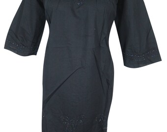 Womans Black Tunic Dress, Boho Beaded Cotton Summer Dress, Comfy LOOSE House Tunic Dresses ML