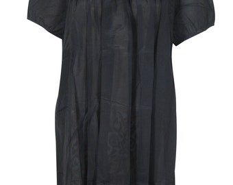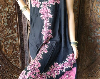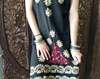 Womens Black COTTON DRESS, Loose Bohemian Retro Summer Embroidered Housedress ML
