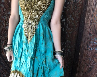 Womens Beach Dress, Blue Purple Floral Dress , Layered Spaghetti Strap Boho chic Recycled Sari Printed Sundress SM