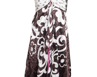 Womens Beach Dress, Brown White Floral Dress , Layered Spaghetti Strap Boho chic Recycled Sari Printed Sundress SM