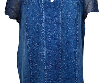 Only 1 leftWomen's Top Blouse, Bohemian Embroidered Stonewashed Blue Cap Sleeves Tunic Tops xlarge