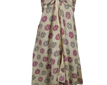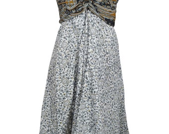Womens Beige Floral Dress ,Beach Dress, Recycled Sari Printed Spaghetti Strap Boho Tank Dresses SM