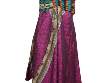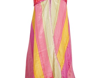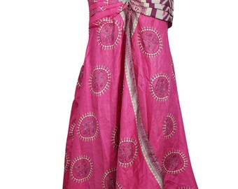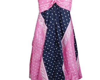Womens Tank Floral Dress, Pink Beach Dress, Layered Spaghetti Strap Boho Recycled Sari Printed Dresses SM