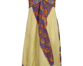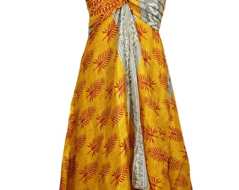 Womens Floral Dress ,Boho chic Recycled Sari Yellow Printed Sundress, Layered Spaghetti Strap Beach Dress, SM