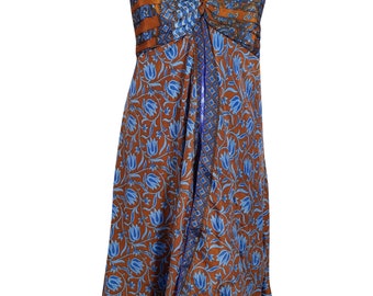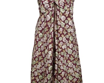 Womens Brown Floral Dress ,Recycled Sari Printed Sundress, Layered Spaghetti Strap Beach Dresses, SM