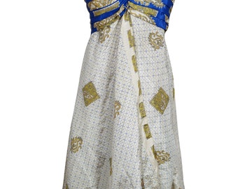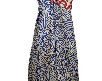 Womens Floral Dress ,Blue Beige Recycled Sari Printed Sundress, Layered Spaghetti Strap Beach Dresses SM