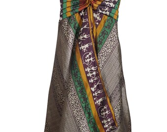 BOHO GIRL Swirling Hi Low Dress Recycled Sari Autumn Gold Printed Strapless Gypsy Maxi Dresses M/L