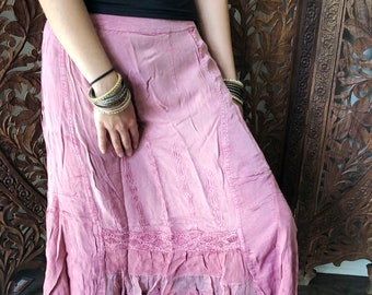 Womens Maxi Ruffle Skirts, Pink Stonewashed Summer Skirt, Embroidered Bohemian Skirt, A-line Peasant Skirts S/M