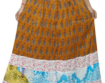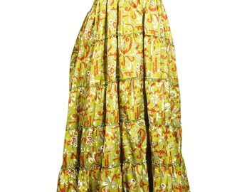Women's Maxi Skirt, Printed Floral Gold Cotton Skirt, Casual Summer Bohemian Long Skirts S/M