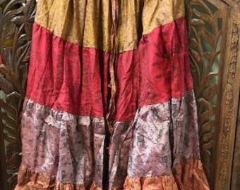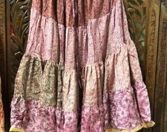 Bohemian Maxi Skirt, Womens Recycled Sari Full Flared Skirt, Pink Copper FLORAL print Beach Summer Skirts M/L