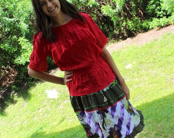 Womens cotton green Skirt, Bohemian red top, MIX MATCH ,Cotton Skirt, Hippe Boho Chic Summer sKIRT SM 2Pc Set