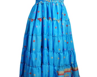 Women Maxi Dresses, Blue Floral Printed Dress, Summer Beach skirt, Recycled Sari Dresses S/M