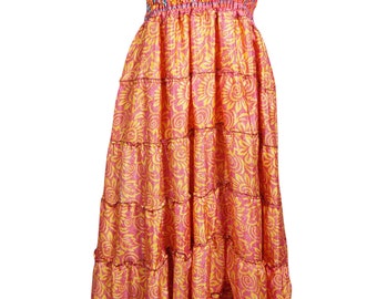Women Maxi Skirt, Strapless Dresses Peach Floral Printed Dress, Summer Beach skirt, Recycled Sari Dresses S/M